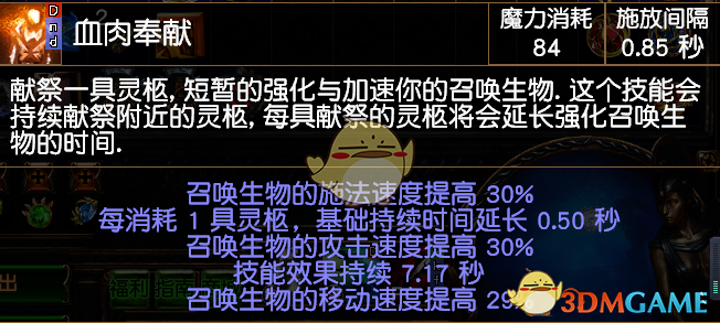 (20级的血肉奉献可以给召唤生物提供30%的攻击及施法速度,配合持续时间延长及每次10个灵柩的亵渎之矛,可以让奉献存在时间持续7秒以上。而死灵师的暗影迷踪配合持续时间延长则可以做到无限循环,1月11号更新后暗影迷踪被一刀切,但还不至于不能用。还记得刚刚那140.06%的施法及攻击速度吗?再加上血肉奉献提供的这30%的攻速,哦对了,别忘了衣服上还有一颗辅助技能是“多重打击”!多重打击除了为魔侍提供95%攻速外,还能让魔侍的挥刀重复2次。现在再来看看攻速:多重打击95%+血肉奉献30%+迅捷瓦尔迅捷非诅咒光环效果140.06%=265.06%,你以为这就完了么?)