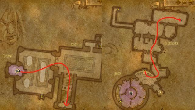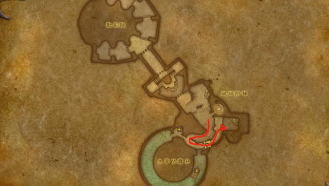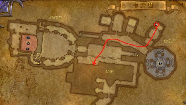 在点击了传送门后,回到进副本的路口,之后按照图片中的箭头方向移动,如果没有在击杀了莫罗斯后,没有拾取钥匙的话这里的门不会打开,拾取钥匙之后这里的大门就会打开着了,之后便需要一路跑到馆长这里。