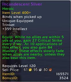 理论上,如果你可以一个人全程站在角落远离所有人,这个饰品特效就价值全程的270爆击和84精通。这显然是最好的情况,因为这一属性总量远远超过了同装等的属性饰品的期望。
