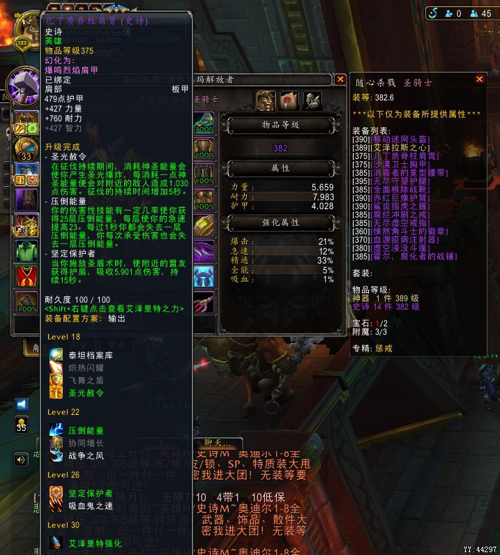 在8.15中每件装备都会新增加一个新的特质,也就是说,到了8.15,你的特质装将有两个新的大特质,这个是影响你职业属性最重要的存在。比如你的一件特质装里,第一层有了圣光赦令,然后在第二层的时候出现了苍穹之力,那么这件特质装就是圣骑士最极品的装备。配合着神圣风暴,在输出的时候你就会有无限的神圣风暴,别看风暴是个AOE伤害,只要怪物数量是两只以上,不用犹豫,圣殿裁决直接放弃打神圣风暴,DPS绝对不会下两万。