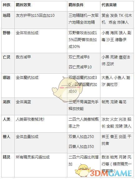 种族:每个种族在场上的不同类棋子达到一定数目就可以发起种族羁绊,拥有特定的种族效果。目前有:人类,野兽,亡灵,地精,巨魔,精灵,恶魔,娜迦,食人魔,元素,矮人,龙。
