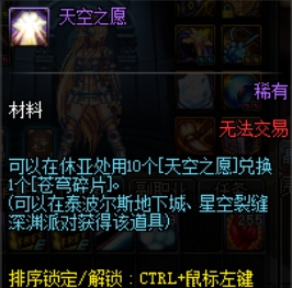 在掉落史诗和哈林材料的同时,每次星空裂缝也会稳定掉落5个天空之愿,且有极低概率直接掉落5个大材料苍穹碎片——大约每刷5管疲劳会遇到一次——虽然这种方式获取材料的效率低下,但在制作版本最前沿的装备方面,这两个地下城将在很大程度上影响制作进度,刷得多也意味着快人一步,建议想先于大部队做出一套泰波尔斯史诗的前沿玩家和土豪玩家在打完泰波尔斯之后将大号剩下的疲劳全部投入星空裂缝,在加速制作的同时也有更多直接获得泰波尔斯成品装备的机会。