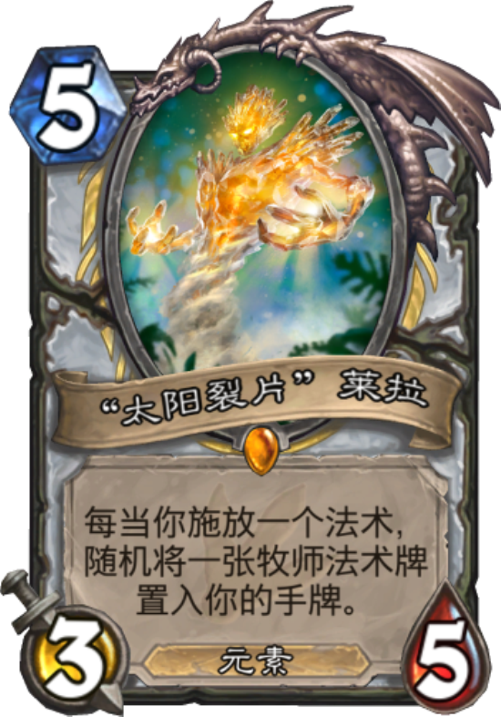 展览牧的另外一张关键卡牌同样是元素,牧师的这张减法力消耗的牌看上去和法师的巫师学徒差不多,但毕竟屁股更大,更难被解,所以强度也是更高一些,很多牧师卡组都是必带的,不过马上这张卡就要退环境了,牧师又该怎么办呢?