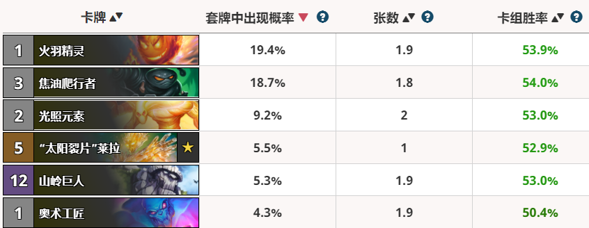 所有的元素里面,出场率最高的就是火羽精灵了,无论是快攻卡组用来前期站场抢节奏,还是控制卡组用来减轻前期压力,甚至某些元素卡组用来当元素链,它都是不可或缺的,超强的适用性让很多卡组都会带上它。