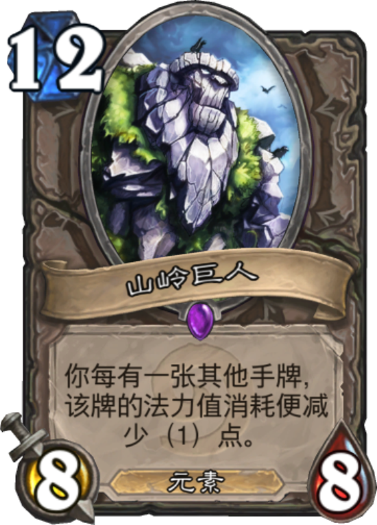 山岭巨人也是元素,可能很多人都没想到吧,目前它在偶数术卡组里面非常活跃,基本上都能低费下场,很容易造成局面压制效果,就算被解也能让后面的各种大哥更加安全,话说这个大哥感觉更像小弟哈哈。