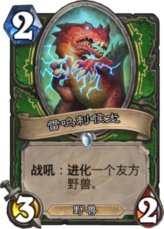 说到猎人最近几个版本的崛起,雷鸣刺喉龙可以说是排头兵了,本身完全不亏身材,还能让一个友方野兽强力很多,前期用来抢节奏,中期用来抢血,后期也能根据形势选择不同的进化方向,真的是非常灵活啊,只要不是奇数猎,它必然是有上场空间的。