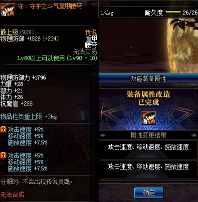 这样一个三速度的艾肯就完成了,如上图,新版本艾肯的最大的好处就是套装属性固定(当然你也可以当做是缺点)。好处是什么呢,比如你现在弄头肩,上衣,腰带,鞋子四件艾肯,然后未来的某一天突然爆到了霸域鞋子,那么就可以直接把霸域鞋子换下来,它的套属自然就变成三件套了,不影响属性。换做是老版本艾肯,换了其中任意一件装备,套属就废掉了。