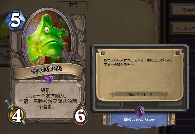 食肉魔块是炉石传说在狗头人与地下世界发布的一张中立紫卡。因为能够消灭我方随从,并且亡语吐出两个被吃掉的随从,在很多的卡组套路如魔块术、亡语猎以及城墙德等卡组中都发挥着重要的作用。然而你是否想过食肉魔块吐出来的不是吃掉的随从,而是其他两个随从?或者两个法术?或者是英雄卡牌?接下来给大家分享下外国玩家的一个测试结果。