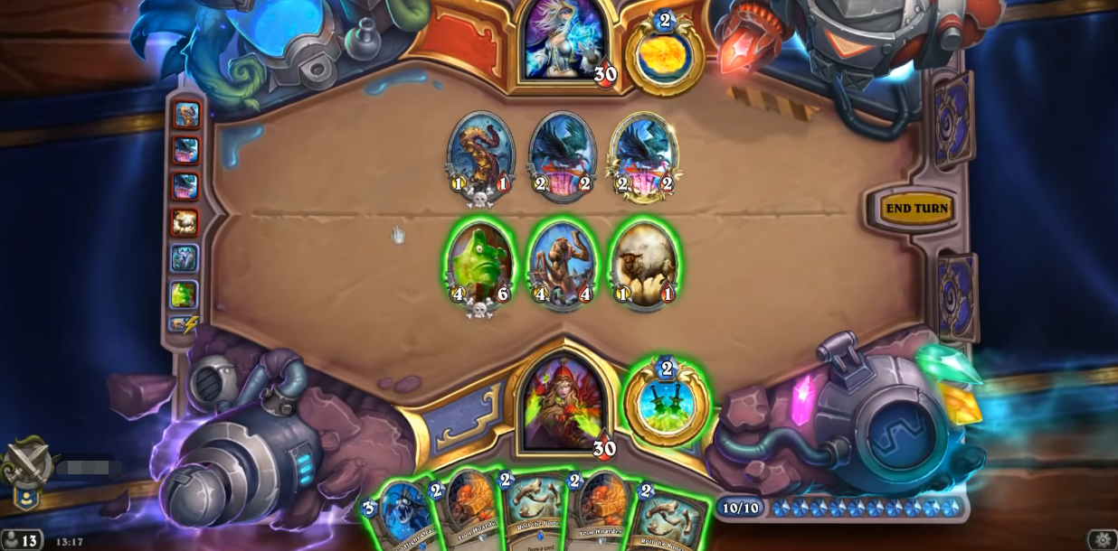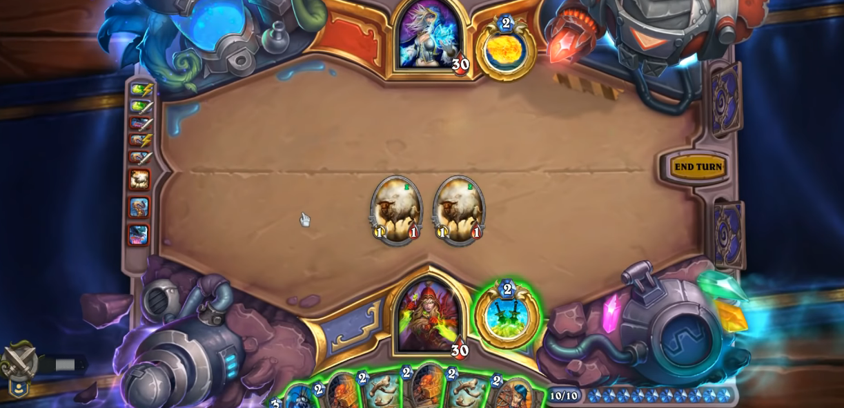 首先是盗贼上了阿努巴拉克,然后用魔块吃掉阿努巴拉克,触发亡语召唤一只44蜘蛛,然后再上回手的阿努巴拉克,然后被对面的法师羊了。最后撞死食肉魔块后,吐出的是什么随从呢?请看下图。