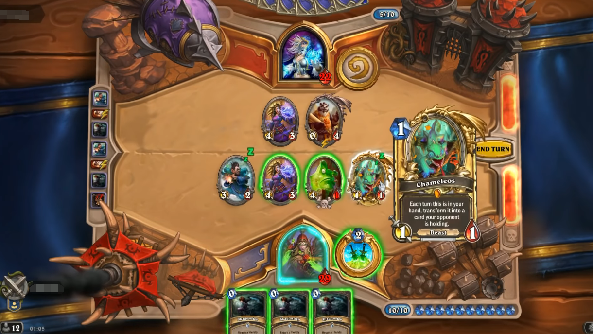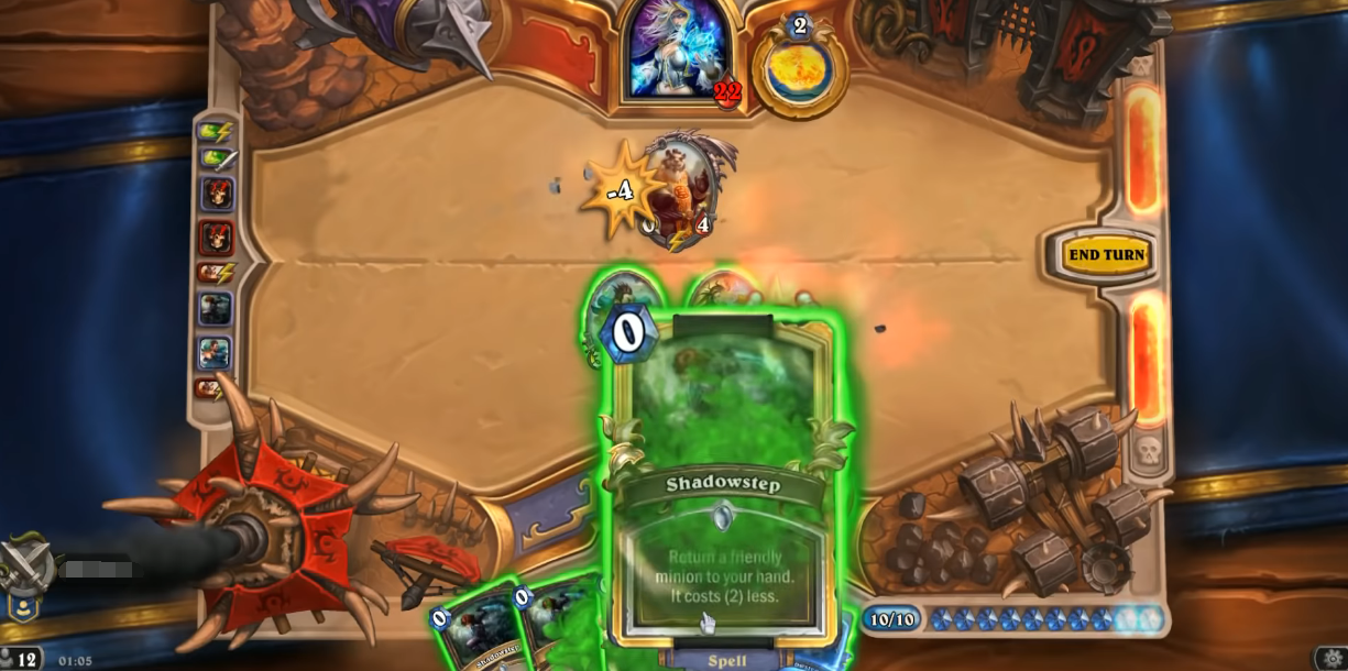 吐出法术的这个bug是在上一点对手法师羊了我方新上场的阿努巴拉克后,用侏儒变形师和暗影步配合变出1费的牧师橙卡变色龙卡米洛斯之后,该随从变成对面通过周卓获得的暗影步法术,然后撞死食肉魔块,于是神奇的一幕便出现了!