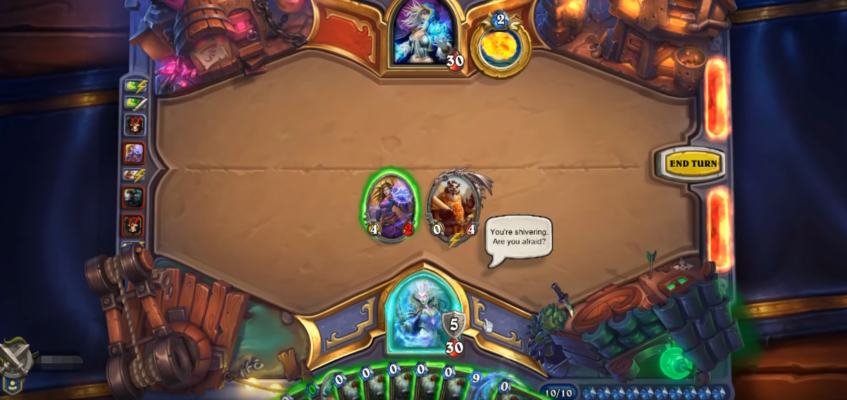 同样延续上面的操作,当变色龙变成对面的法师DK的时候,撞死食肉模块的时候,并不是和本文的第一点和第二点的情况类似,并非会给你两张法师的DK卡牌,而是让你直接变身DK,不触发召唤水元素以及变更英雄技能,而是直接变成带有5甲的变身后皮肤,如下图所示: