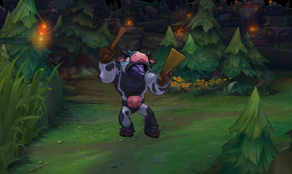 牛头在玩家不怎么会玩的情况下选出来,很多都会尝试敲钟这个动作,当你选出这个皮肤的时候,往下路一站,敲上一会绝对会让对手和队友崩溃。很多玩家会有点讨厌这个皮肤,但娱乐局中其实不在意那么多,尤其是你和朋友一起开黑的时候,打野推个雪球,中单变个身,下路敲个钟,随着最后己方基地的爆炸,就可以琢磨着下一局怎么快乐了。不过当队友里有路人玩家想赢的话,还是不能太过分了,该好好打还是要好好打的,偶尔敲一会就行了。