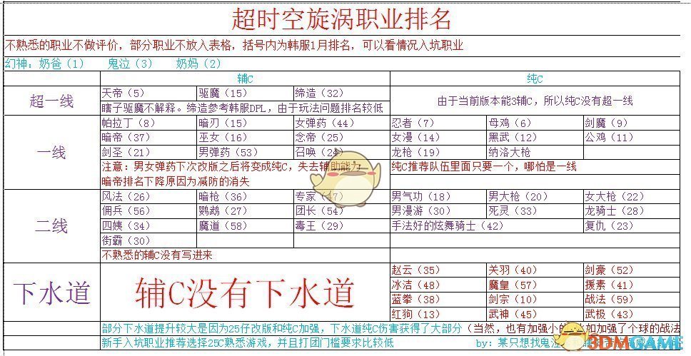 上图这份职业排行表是韩服11月份开95级的职业排行,而国服目前也刚开95版本,这份职业排行其实和国服目前是相符合的,其中可以看到这排行确实是很真实,纯C职业基本上都是在10几名开外,特工虽然在韩服牌第四,但在国服这职业并不吃香。