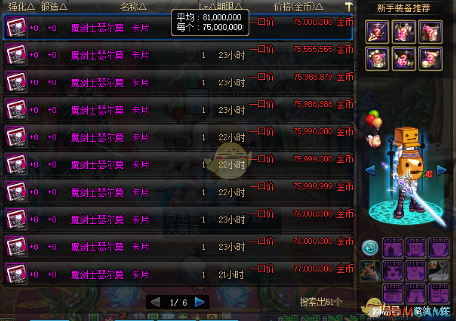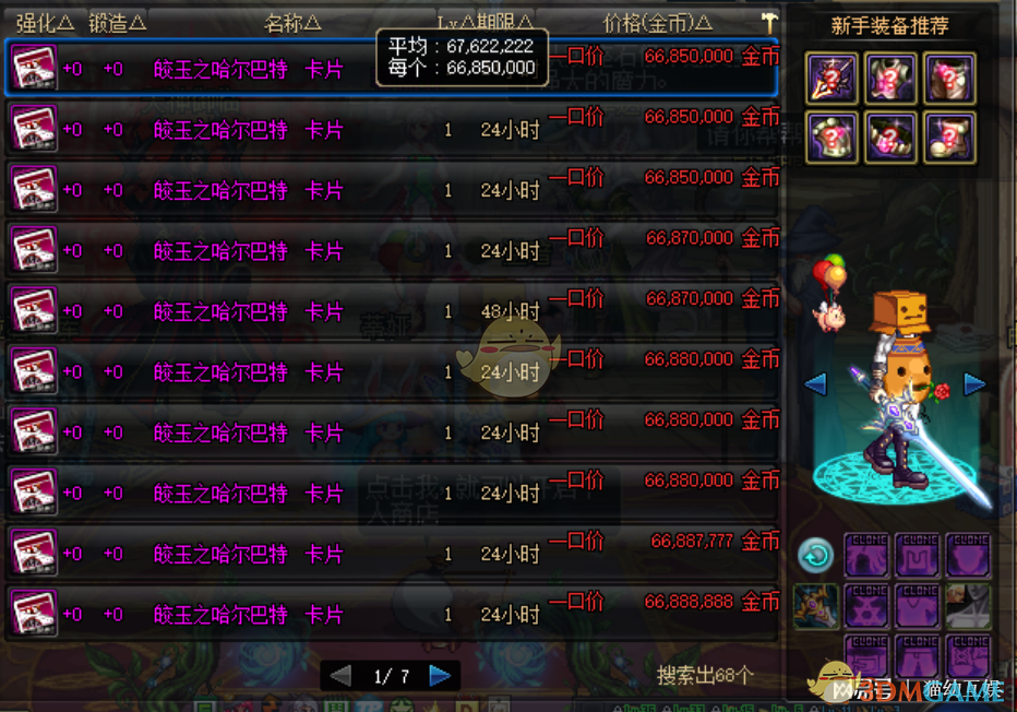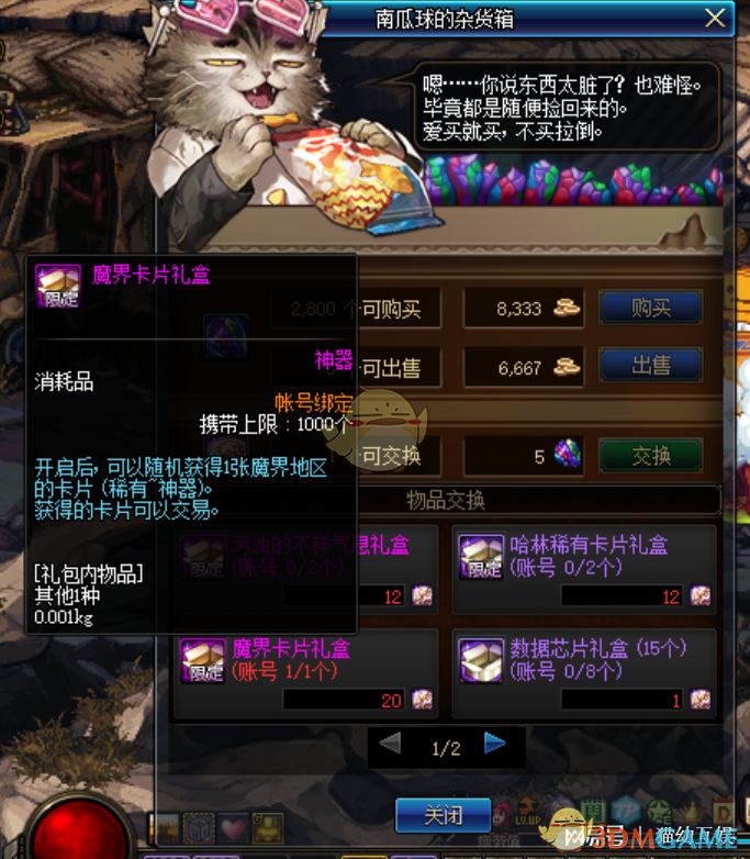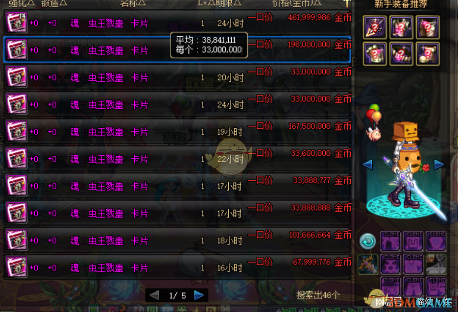 其实这两张卡片还有可能会降价,原因很简单,在哈林地区有一个名为南瓜球的NPC。每天花20个五芒星币也就是100个时空石,就可以兑换一个魔界卡片礼盒,里面不仅能开到地轨中心的BOSS卡片,也能开到泰波尔斯以及哈林地区的BOSS卡片,这也会增加卡片的数量。而且打泰波尔斯的时候,也有几率掉落BOSS卡片册,都比以前直接打BOSS爆卡片的几率高了,所以产量也会变高。所以平民不妨也可以趁这个时候附魔一下,到时候被商人垄断了可能价格又会出现变化。