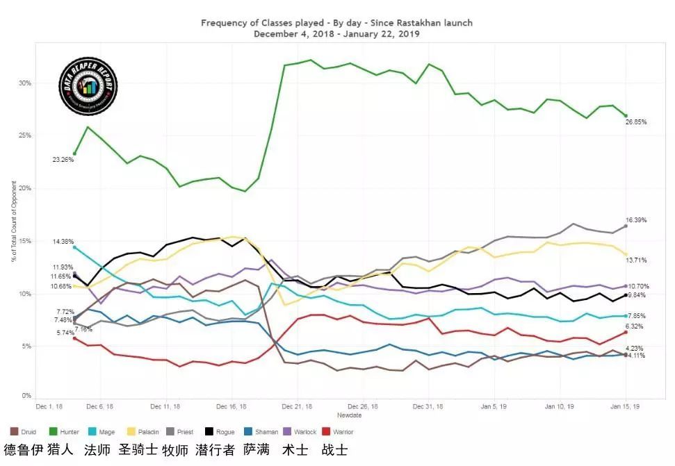 在排名前三的职业中,圣骑士的变化最大。虽然奇数骑仍然是传说之外最常见的卡组,但是元气骑已经成为现在传说分段最受欢迎的圣骑卡组。这对天启骑来说可不是什么好消息,他的数量很可能会出现下降。术士也在转型,机恩术成为各分段中最受欢迎的套牌。在环境中我们观察到夺尸者体系越来越受欢迎,而表现不佳的巫毒娃娃体系正在下降,动物园在高分段已经基本绝迹。