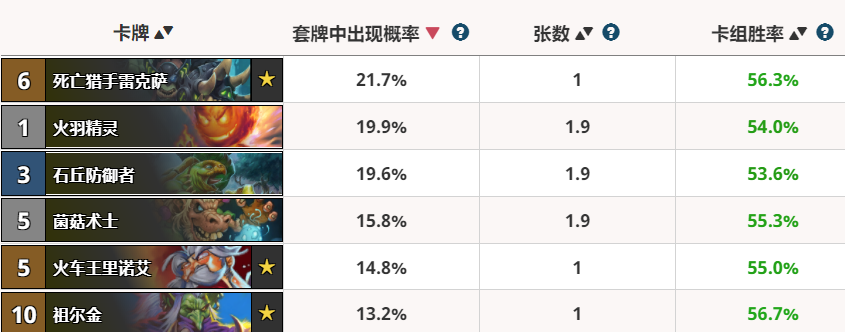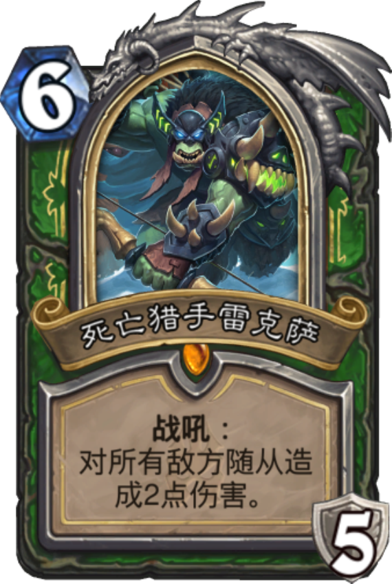 而所有战吼卡里面,出场率最高的就是猎人英雄卡了,他让以快攻为主的猎人也有了打后期的能力,一张卡就能对付一个卡组了,基本上所有的猎人卡组都会带上他,加上猎人这个职业现在很强势,这张卡的出场率是超过了所有中立战吼卡的,不得不说太imba了