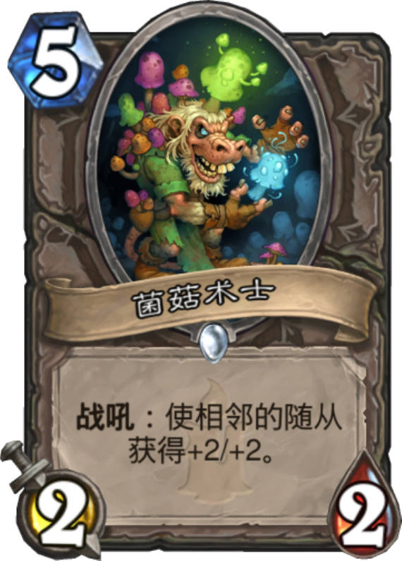 除了火车王之外,菌菇术士也是很多铺场卡组的最爱,它下场基本可以在当回合增加4点场攻,虽然比火车的6点伤害低一点,但没有负面效果,增加的攻击和血量也能用来解场和防守,适合中期来抢节奏。