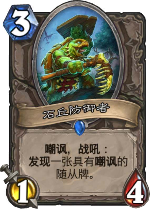 说到314,自然就想起了被打击无数次的大猩猩,石丘防御者的属性是和大猩猩一样的,但却得到了很多人的喜爱,主要就是发现嘲讽太超值了,战士用来做任务,骑士用来找大哥,其他职业也能找到适合当前形势的卡,自然成为了很多卡组的宠儿。