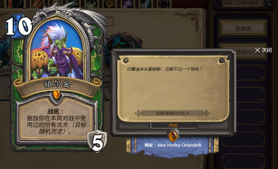 什么,听说你想要来我身边?不存在的。因为我们大家都知道,作为导演家族的一员,如果不会出现误伤,那真的是不可能的事情。比如必要时刻标记用在了自己的大哥身上,再比如,一张杀戮命令,帮忙解决掉了自己的一个随从,虽然,在目前看,祖尔金这张卡牌似乎暂时处于强无敌的状态。但是难保他哪一天不会突然反水。是的,你没看错,突然变成自杀成就。