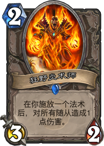 炉石传说中有很多的随从天生就是苦命人,要么不上场,一上场就是被人出卖的,狂野炎术师就是其中之一。作为一张老牌的经典卡包二费随从,狂野炎术师的出场率一直居高不下,跟牧师圣骑士都有着非常不错的配合,特别是搭配圣骑士的二费法术生而平等,四费直接清场(圣盾是例外),多出来的费用还能上怪返场,性价比超高。