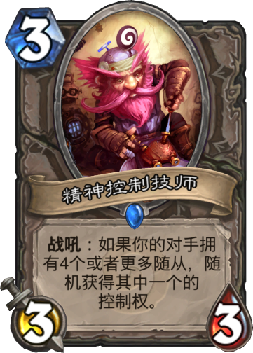 千万不要小看这个粉红色头发胡须的小侏儒,就是因为他,使得大部分炉石传说竞技场玩家都不敢上第四个随从,这到底是为什么呢?首先,精神控制技师本身3-3-3的属性还算可以,在竞技场迫不得已可以裸上,战吼的话虽然比较卡手,不过一旦触发,随机控制敌方一个随从,很有可能夺取对面的大哥,直接劣势变为优势。后来,连暴雪都看不下去了,将精神控制技师从竞技场移除。