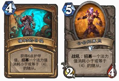 招募从牌库拉,手牌式招募则是从手牌直接入场,同样不会触发战吼、连击、抉择效果,总体上稳定性比牌库招募高,但是会消耗一张手牌。