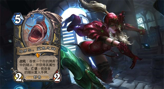 No.5 格罗尔鲨鱼之神,盗贼的职业橙卡。鲨鱼之神在发布初期,我在天梯上还有见过一两个玩家在随从流的盗贼卡组里塞一两张。无奈,现在奇数贼的强度早已榨干盗贼玩家开发新卡组的欲望。即便是和鲨鱼之神很契合的亡语流,也不如走蓝龙体系的爆发更爽。所以,格罗尔鲨鱼之神这张卡的遇冷就可以预料了。