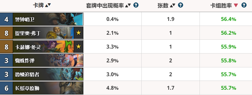 榜首则是一张比较冷门的卡,其实这张卡出来后还是被很多人看好的,因为圣骑士的奥秘其实都不错,只是比较占卡位,警钟哨卫可以拉出来2张,不仅补充了手牌,还压缩了牌库,在目前的奥秘骑卡组中也是非常强势的。