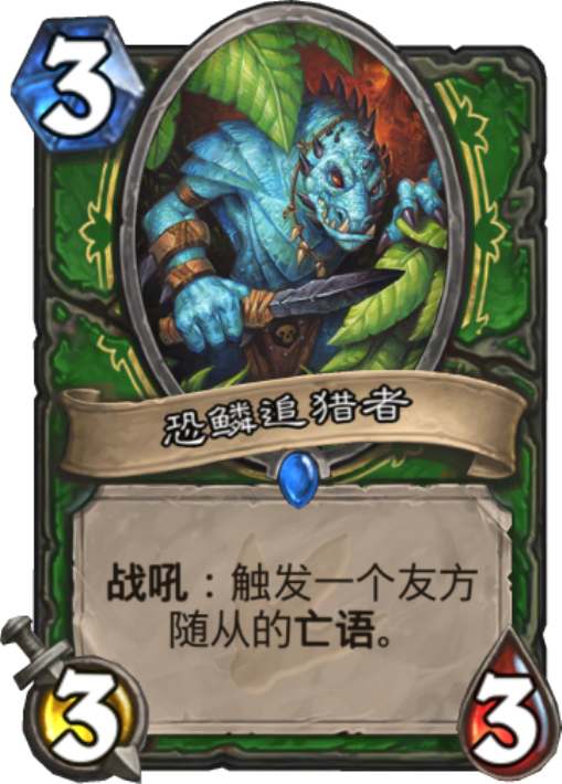 恐鳞追猎者虽然不是亡语,但和亡语有很大的关系,所以在目前流行的亡语猎中是核心,卡组中的亡语都比较强大, 恐鳞追猎者可以直接触发效果,无疑让这些卡的价值再次提升。