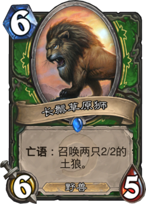 虽然现在猎人卡组中的橙卡不少,但在以前百无一用猎人橙的时代,狮子还是公认的猎人橙卡,本身65的身材,加上2只土狼就是10,9的身材了,在6费的野兽卡中,无疑非常强力,如今在中速猎卡组中还是很强势的。