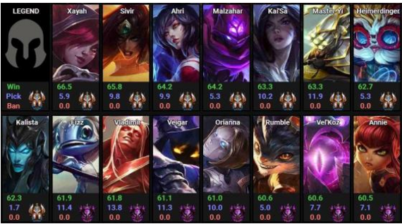 据外网统计,胜率最高的八个英雄霞、希维尔 、阿狸、蚂蚱、卡莎、剑圣、大头、卡莉斯塔。其中adc独占4席,其中霞和希维尔分别以胜率66.5%、65.8%位列第一与第二,射手英雄全面崛起。