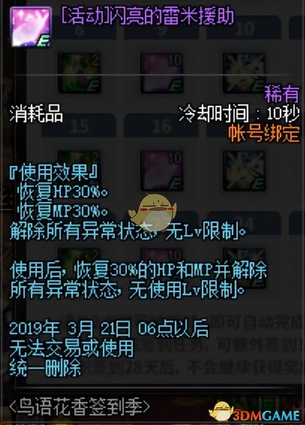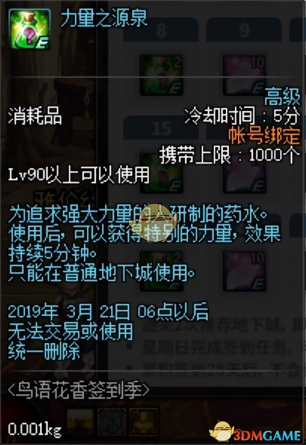 第一天的奖励是力量之源泉,使用后以为是获得持续5分钟的属性加成,但是神奇的事情,这药水一点用处都没有,只能在普通地下城中使用,星空裂缝,黎明裂缝,泰波尔斯均无法使用,而在普通图中使用后,角色变发光了,然后在怪物的脚底出现出现裂缝,然后喷射出爆炎攻击,伤害非常低,在范围内的所有怪物都会受到攻击,搬砖?一点用都没有。