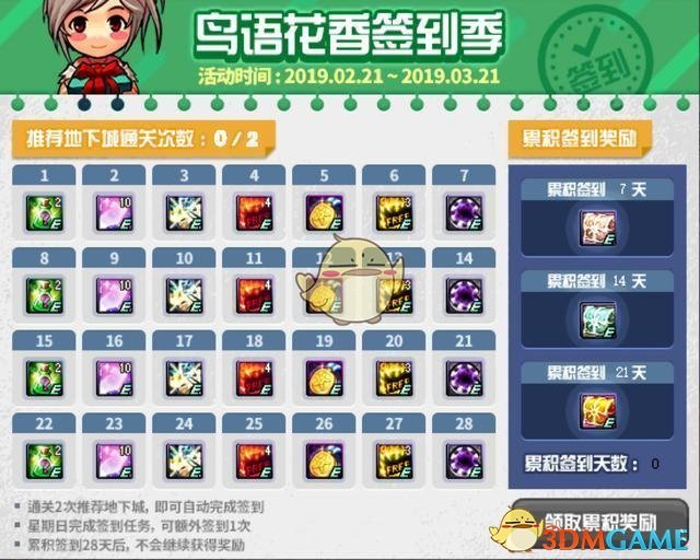 与我们之前的签到活动一样,这一期也是21天领取终极奖励,每天刷2次推荐图自动签到,星期天当天签到的话会额外获得1天的签到数目。因为2月份只有28天,所以活动时间也是28天,可以领取到全部单日奖励。那么我们一起看看这一期的签到奖励究竟如何。