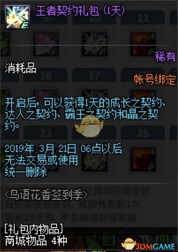 第三天是一个1天的王者契约礼包,这也是每一期必备的东西,没啥好说的。