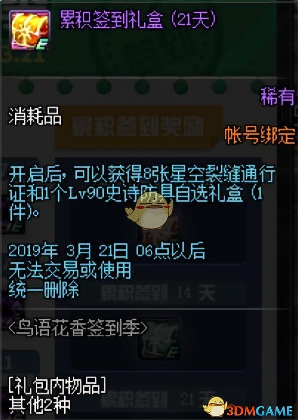 终极签到21天奖励,8张星空裂缝通行证,1个90级史诗防具自选礼盒,95版本送90史诗,习以为常了,毕竟90版本送85史诗都是最常做的,而这一个自选完全就是的打脸了现在罚站活动啊。