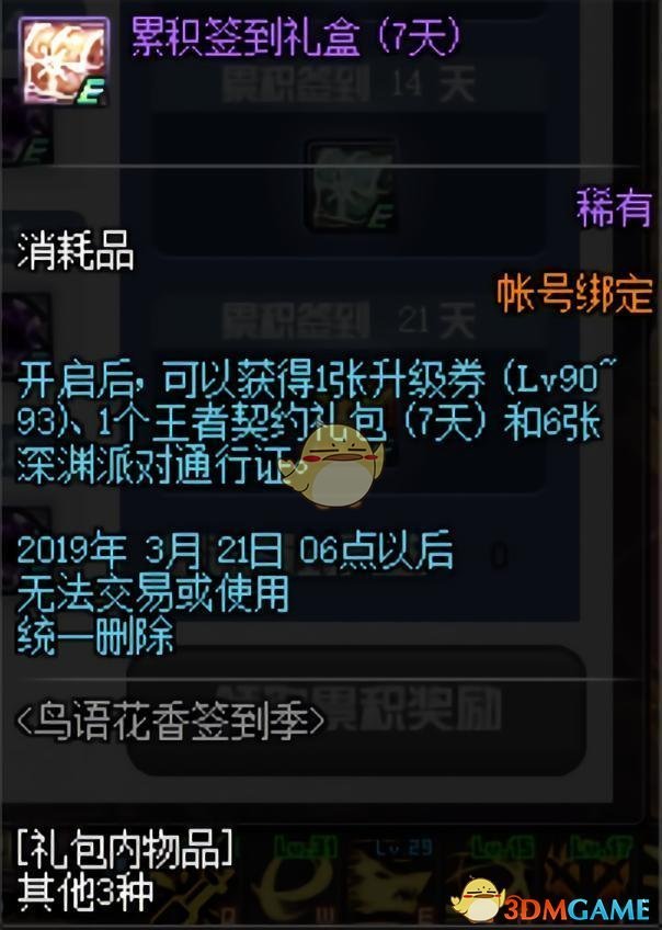 累计签到7天送1张90到93级可以用的升级券,7天的王者契约和6张深渊派对通行证,好吧,送3张星空裂缝通行证也行啊,普通深渊票多的是。