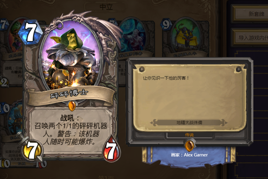 首先7费7/7的身材就非常不错,除此之前还有2个1/1的小炸弹,小炸弹不仅可以站场、解场,甚至还能起到斩杀的作用,这也使得在那个版本中砰砰博士基本是大家必带的卡牌之一。而最厉害的是,砰砰博士不单单是一张卡牌,甚至还延伸出一个版本,试问有哪张卡牌有这个待遇?