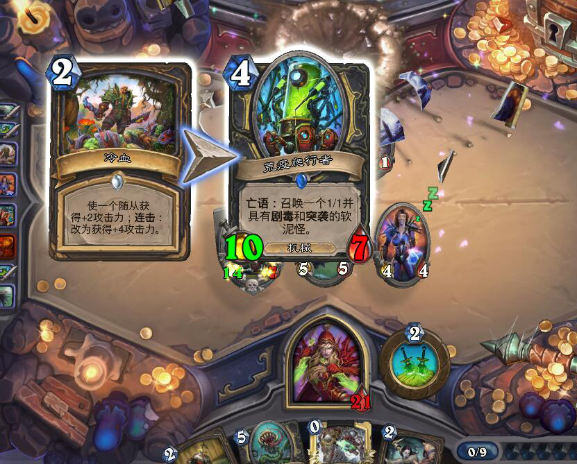 冷血搭配疯狂的药剂师,能打出一套非常可怕的COMBO。只要场上有生物,而对方血又相对比较少的话,这套斩杀绝对杠杠的。不过,话分两头说,在目前天梯中,盗贼除了奇数贼玩法之外,其余玩法似乎没啥存在感。
