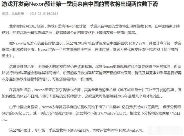 韩国游戏开发商Nexon将近一半的营收来自于中国,而腾讯为期代理发行的PC游戏《地下城与勇士》,游戏上线的时间更是有十年之长。从Nexon最近发布的最新财报显示,该公司来自中国的营收下了22%,预计今年第一季度也依旧下滑两位数。