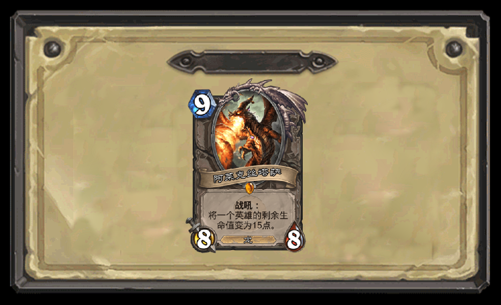 最后一个便是玩家们熟知的红龙女王——阿莱克斯塔萨。也许会有小伙伴们疑惑:“红龙不是只吹血,而不削减护甲?”。但是,在早期的设定中,这张9费的红龙确实能够直接削减护甲以及血量,无论多厚的护甲,只剩15点的血量。
