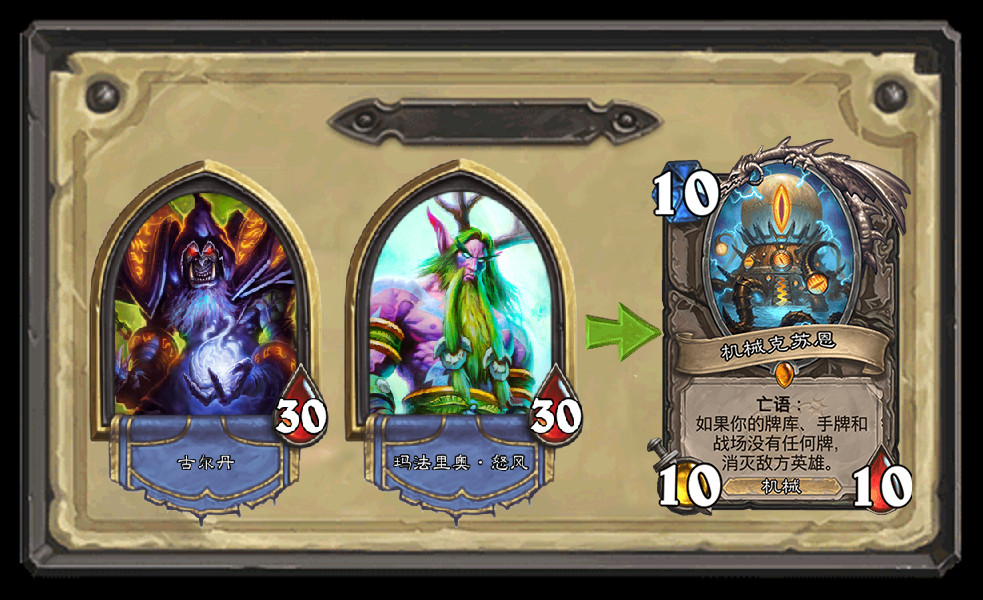 机械克苏恩是砰砰计划版本中的一张中立橙卡。在最早的古神版本中,克苏恩成为了四大古神的“先锋卡牌”(白送的橙卡,心疼小克!),在砰砰计划版本中推出了它的“复刻版”,反而变强了!所以,在擅长超越费用极限的德鲁伊职业和特殊构筑下也能实现超越10费的术士职业,成为了机械克苏恩的最大拥簇职业。在标准天梯中,机克德能够实现“叠最厚的甲以及飙最快的车(抽牌速度超快)”,机克术的抽牌速度在一系列中立过牌以及本省英雄技能的加持下,也不遑多让。所以,机械克苏恩系列卡组作为抽空牌库,用光手牌以及场面不留随从的条件下,就能实现无差别斩杀对手,确实也再次印证了“护甲都是纸”的说法。