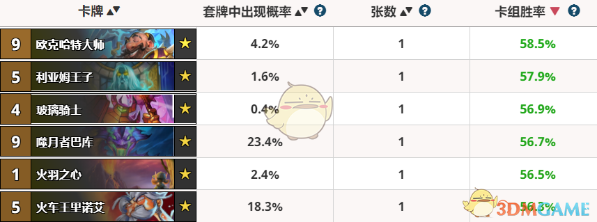 排名第一的则是中立卡欧克哈特大师,这张卡又再次火爆起来,除了以前的墙德会用之外,新兴的超强卡组城墙牧(卡组见上次文章)也是把他作为了核心,一旦他下场就是连续不断的铺场,效果真的很强大!