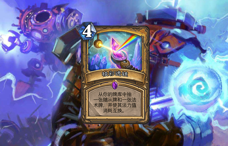 除了责难,圣骑士还有一张牌能够改变法术牌的法力值,那就是棱彩透镜。和以上的卡牌有所区别的是,棱彩透镜能够互换牌库里的法术牌和随从牌的法力值。当然,如果碰巧是抽到两张法力值消耗一样的法术牌和随从牌,你就当放个屁吧!