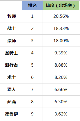 职业排行代表着职业的受欢迎程度,但并不意味着职业强度,玩家们会热衷一些职业,比如牧师,战士,前者偷牌多,玩起来很快乐,往往0胜就滚出了,后者质量高,但节奏能力差,所以一不留神也容易低胜。想要真正赚金币卡包的同学,要注意规避这种情况。上周我们看到牧师,战士和法师最受欢迎,匹配的时候也常常见到这三种职业。