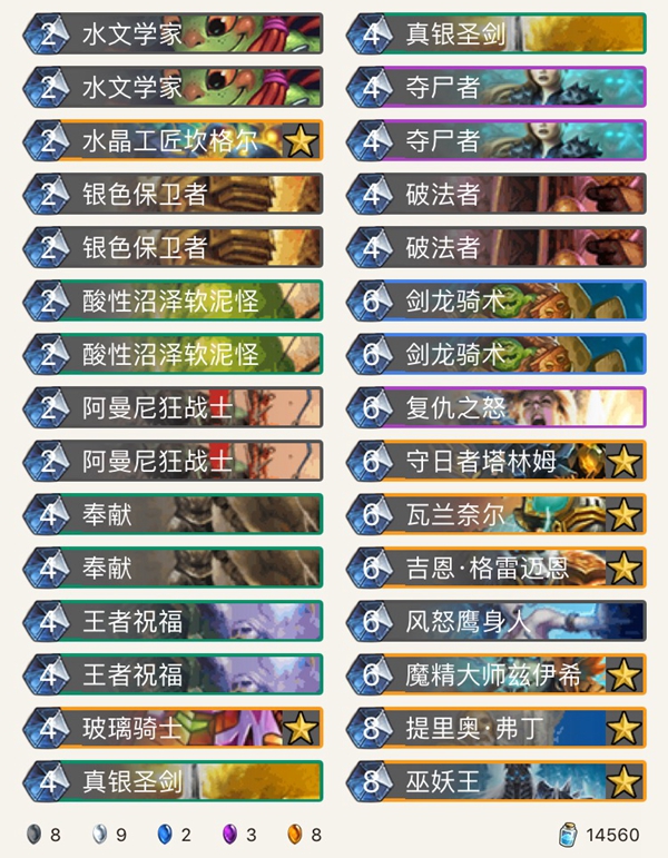 和奥秘骑一样,这套卡组也是最近再度兴起的。主要玩法就是依靠嘲讽的高血量随从在后期配合各种复活法术与神圣之灵、心火来出其不意斩杀对手。
