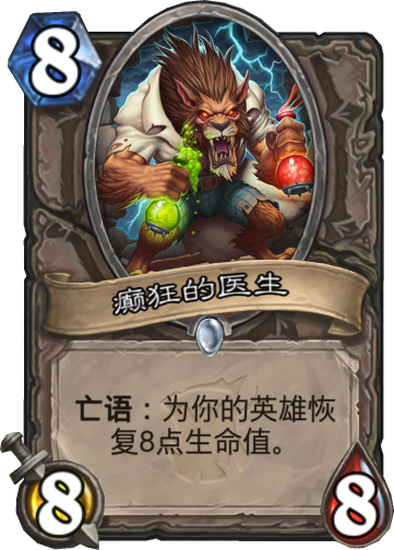 盗贼卡组一向有一种弊病,就是是没有回复,有时候卖脸多了就会突然死亡,这个卡组中加了2张医生,通常可以用其他的手段直接招出来,本身就是一个强大的战力,还能恢复生命,让盗贼的血线始终保存在一个安全的位置,自然容错性也高了一些。