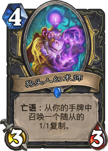 幻术师可以说是这个卡组的初始发动机了,本身433的身材再召唤一个11的复制,看上去不太赚,但关键是这个召唤的11复制也可以带亡语,如白银先锋等,那就是一个亡语连锁链了。