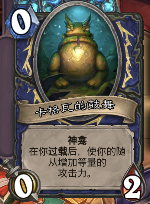 萨满-卡格瓦的鼓舞:过载后你的随从会增加等量的攻击力。
