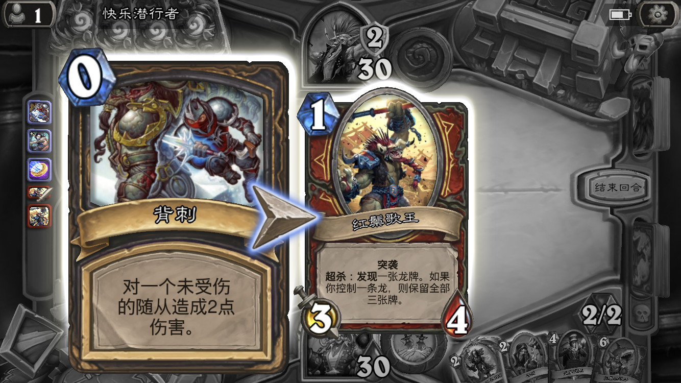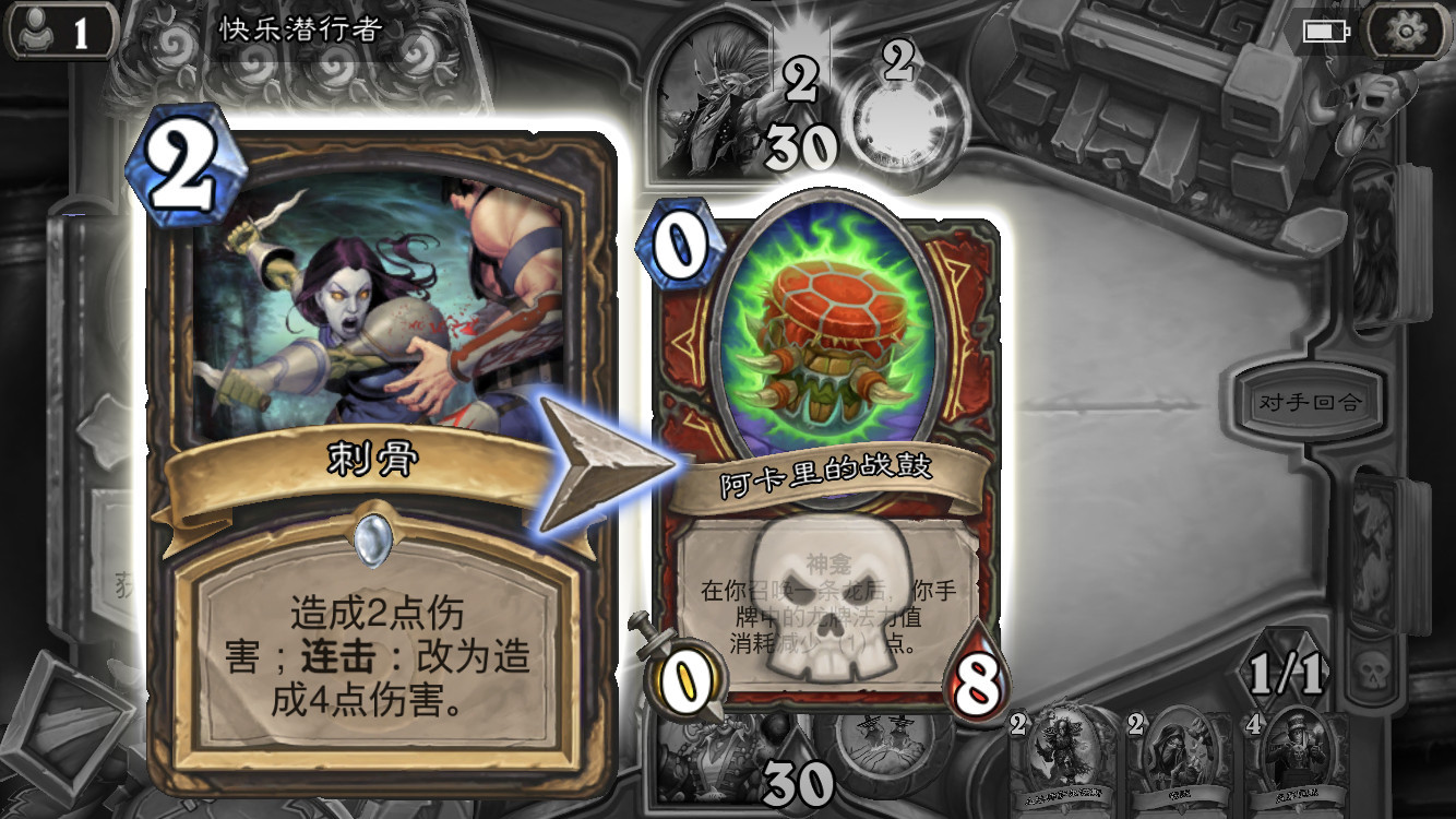 后手贼和先手贼的差距不是一点半点,可以看到对方1费的场面有3/4突袭盒0/8的神龛,竟硬生生的被我一个刺骨和一个背刺全解,这酸爽。然后看到对方名字为“快乐的潜行者”很是应景,我确实很快乐。