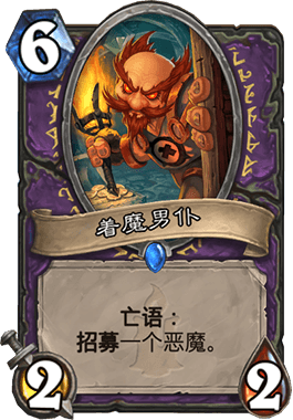 在炉石中,着魔男仆也是一个悲哀的角色。在魔块术兴盛时期,上场被己方秒杀的着魔男仆,可以绕地球好几圈(开玩笑)。它的辉煌时刻,就是召唤牌库中的虚空领主,或者大哥恶魔守卫。但是,更悲催的是,设计师认为它的亡语特效太强了,从5费用被增加到了现在的6费。同时,在早期的黑石山时代的空灵召唤者有时也会被各种上场后直接被己方杀死。